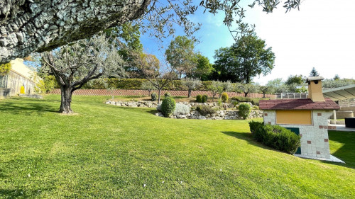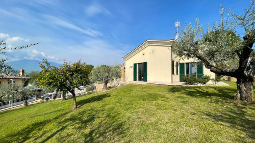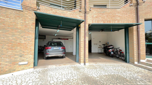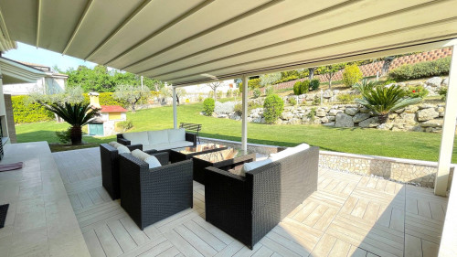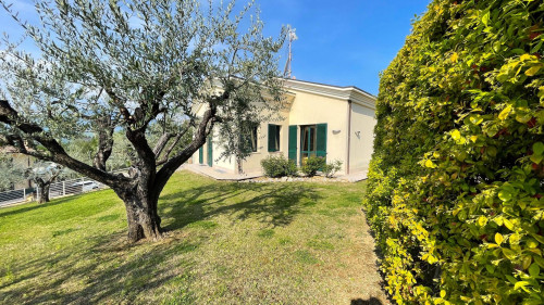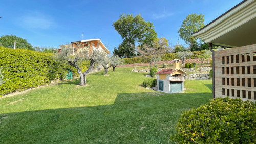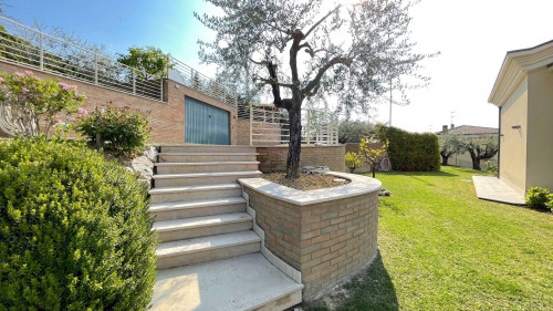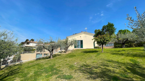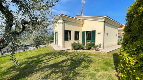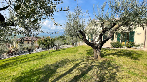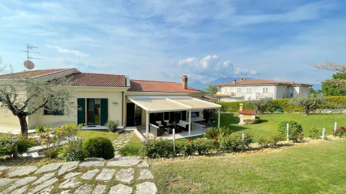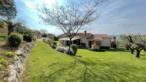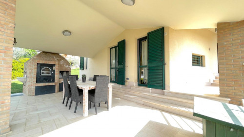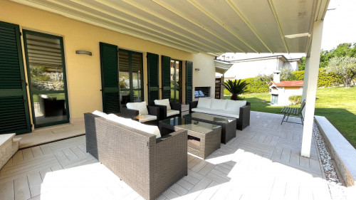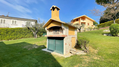La villa è circondata da un ampio parco privato, caratterizzato da un giardino curato con prato verde e alberi di ulivo e da frutta, nonché da zone pavimentate. All'esterno, due tettoie arredate con un salottino da esterno e una zona pranzo con forno a legna e barbecue offrono lo spazio ideale per godersi il tempo all'aperto. Un secondo accesso carrabile dal lato nord con un garage aggiuntivo per due autovetture offre ulteriore comodità.
