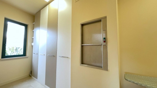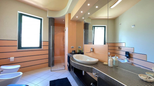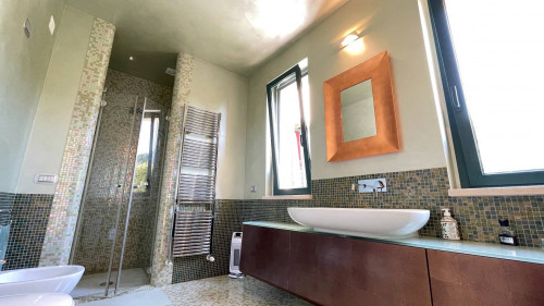 Al piano primo, un ingresso vi darà il benvenuto in un ampio salone con una vista panoramica sulle colline circostanti, una zona open space con sala da pranzo e studio. Una cucina abitabile spaziosa, dotata di una stanza lavanderia adiacente con vano montacarichi collegato al piano terra, offre un ambiente ideale per la preparazione dei pasti. Tre camere da letto matrimoniali di generose dimensioni, di cui la camera padronale con bagno en-suite e cabina armadio con finestra, offrono spazio e comfort. Due bagni con doccia e finestra completano questo piano. Tutte le stanze si affacciano sul meraviglioso giardino della villa, regalando un'atmosfera serena e rigenerante.