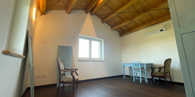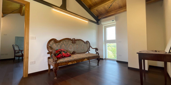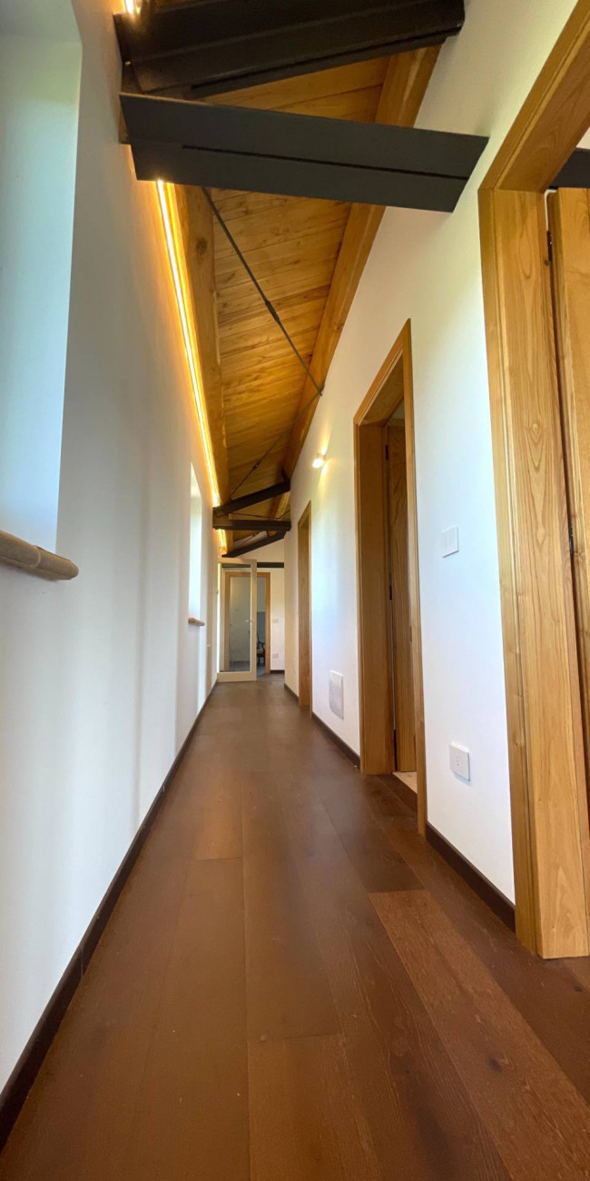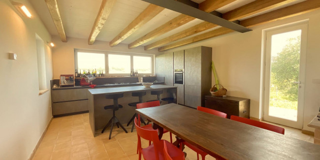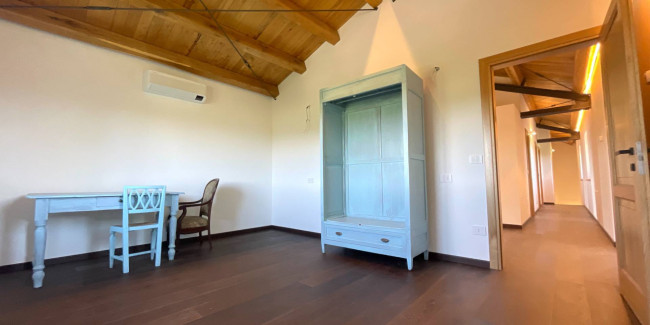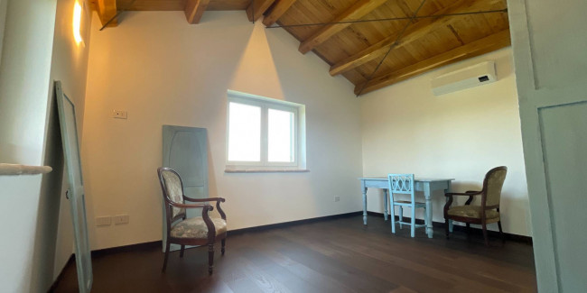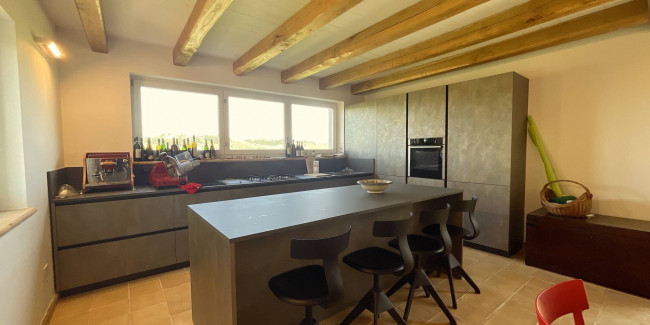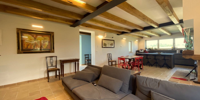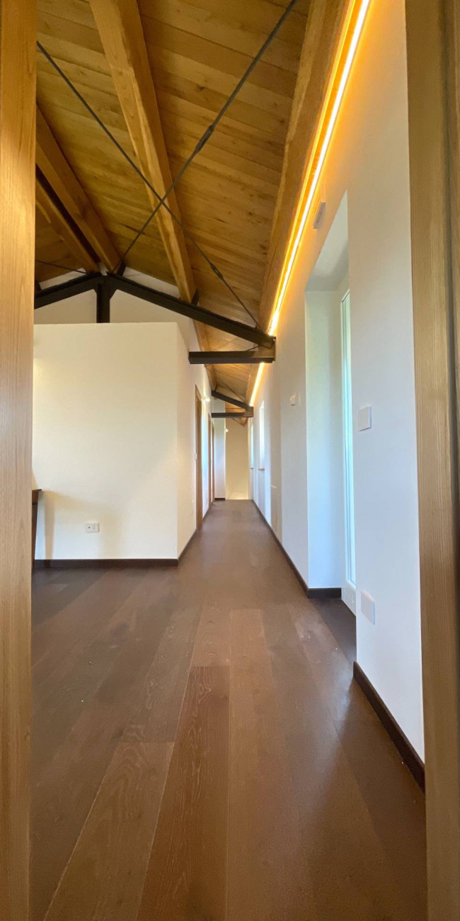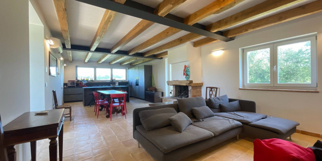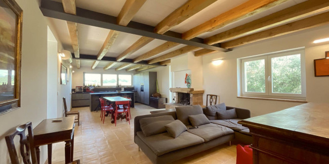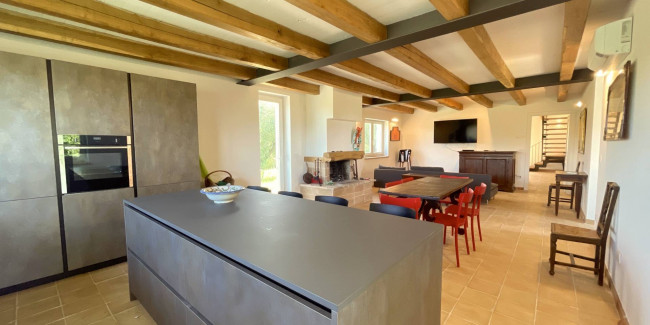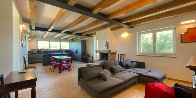 Struttura portante in acciaio e legno di castagno, soffitti con travi a vista, impianto di riscaldamento a pavimento, clima in ogni ambiente, pavimentazione in cotto fatto a mano nella zona giorno e parquet nel reparto notte, porte in legno massello, infissi in legno provvisti di vetri termici e scuri in legno.