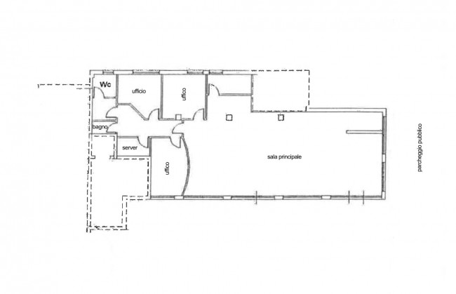 Internamente si presenta in perfette condizioni ed è attualmente suddiviso in una spaziosa sala principale, due uffici sul retro, due servizi igienici (di cui uno attrezzato per persone con disabilità), un ripostiglio e una sala server.